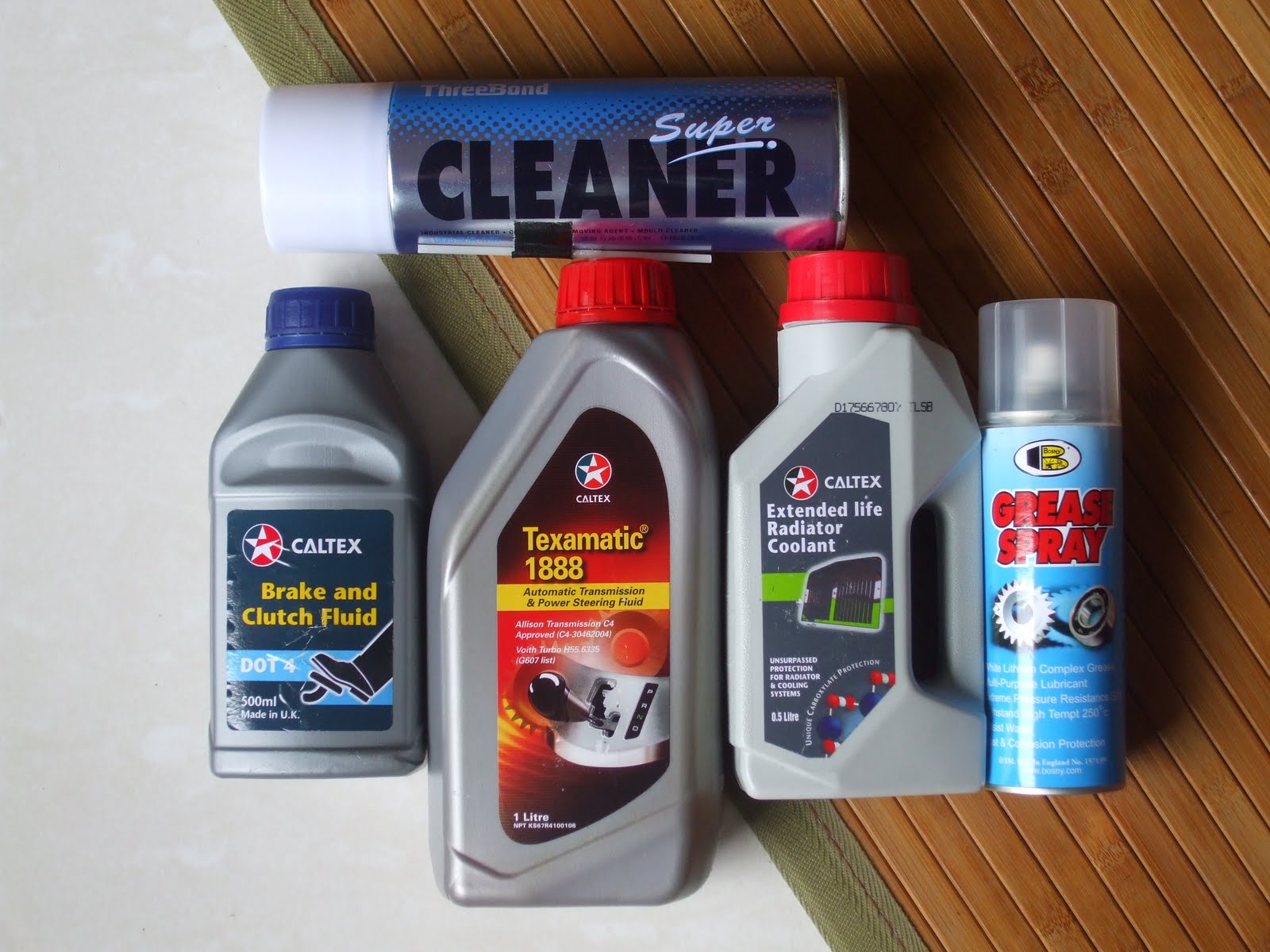 Spare oil for transmission & power steering, brake and clutch fluid, brake fluid and radiator coolant. In addition, carry at least 1 litre of engine oil. The need for these spare oils and coolant is obvious. The Super Cleaner is used to clean throttle bodies or places where dirt and gunk can accumulate. The grease spray is for lubricating areas where there are squeaks or even for a simple job like lubricating a nut before removing it.